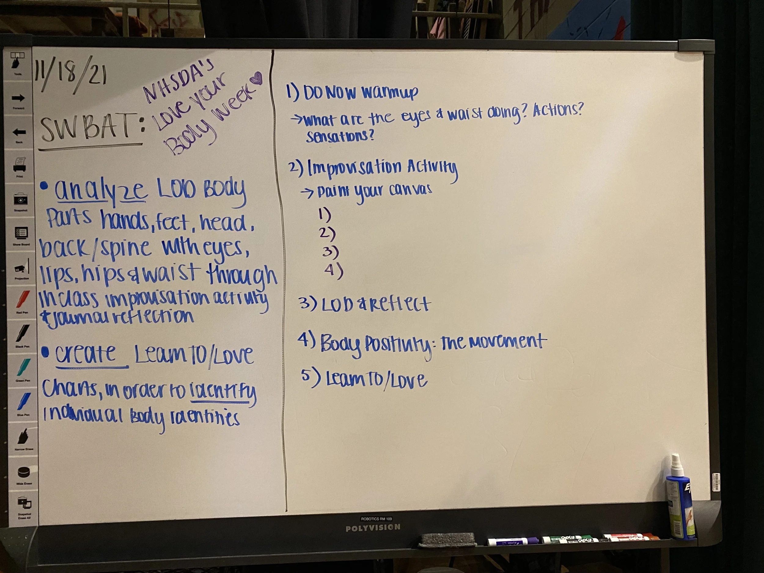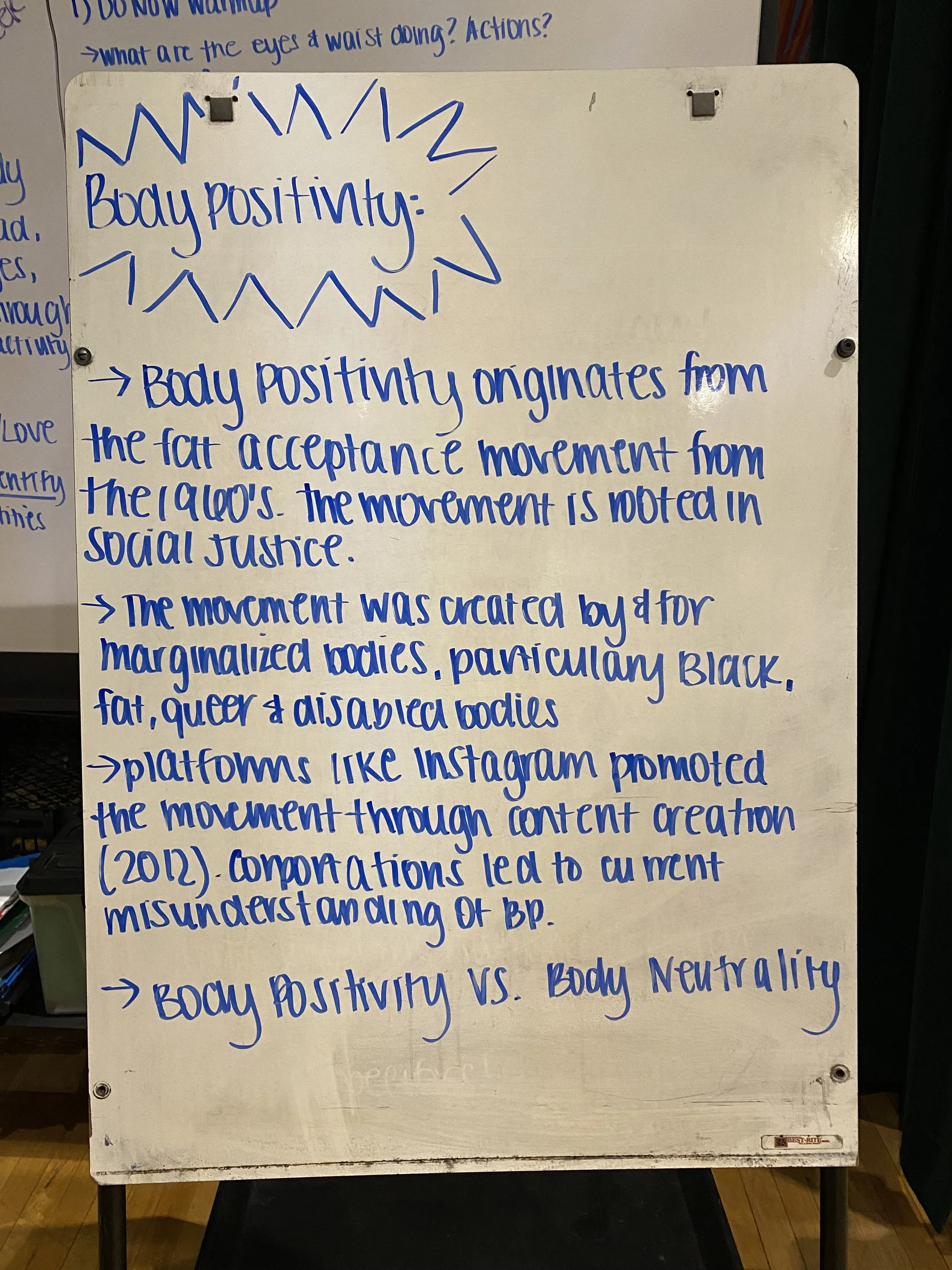 This unit was created for my student teaching internship, intended for high school, grades 9-12. This unit examines and deconstructs body positivity and neutrality frameworks present in today’s society and further discusses the respresentation we see on social media platforms. Utilizing Language of Dance body part symbols, students identify body parts that they love, and that they are learning to love. By creating a solo about all the body parts they love, students are able to express, honor, and celebrate their body identities, for all that they are, and all they will continue to be.